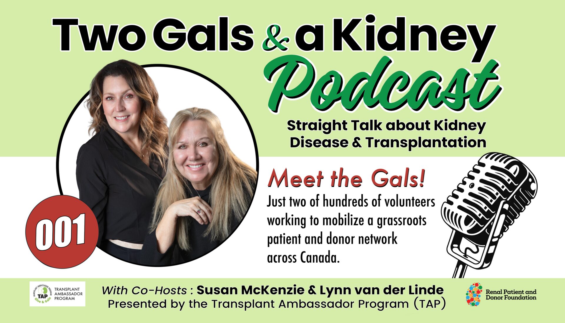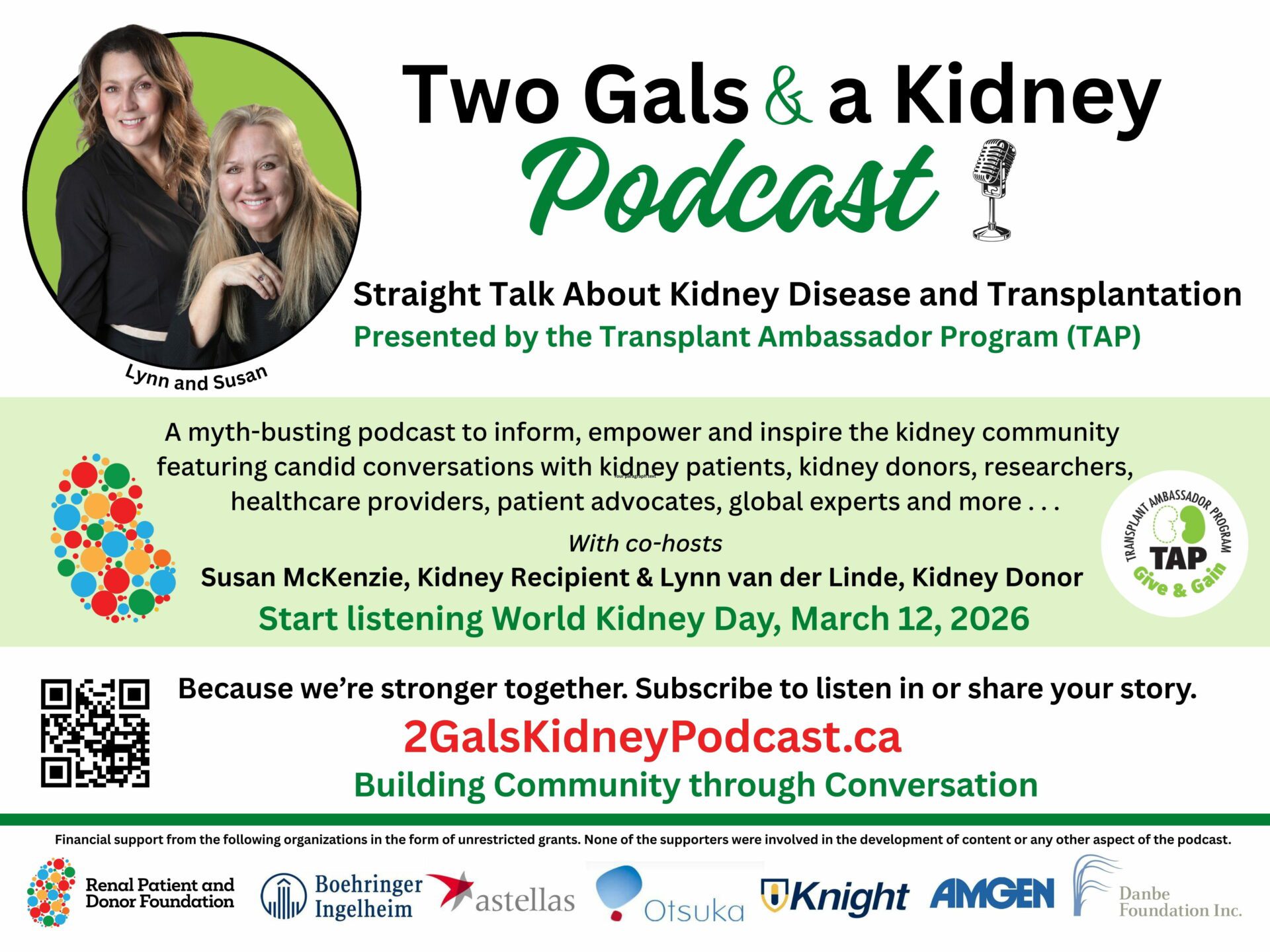 Straight Talk About Kidney Disease and Transplantation Presented by the Transplant Ambassador Program (TAP) A myth-busting podcast to inform, empower and inspire the kidney community featuring candid conversations with kidney patients, kidney donors, researchers, healthcare providers, patient advocates, global experts and more . . . With co-hosts Susan McKenzie, Kidney Recipient & Lynn van der Linde, Kidney Donor
